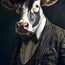 In het middelpunt van dit meesterwerk schittert een vriendelijke koeienkop, gekleed in een tijdloos pak en op elegante wijze getooid met een hoed. Deze gedurfde en unieke keuze geeft niet alleen een artistieke flair aan het schilderij maar maakt het ook tot een verrassend en gesprekswaardig kunstwerk.