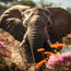 Creëer een ambiance van natuurlijke kracht en bloeiende pracht in je interieur met dit unieke glasschilderij. Bestel vandaag nog dit kunstwerk en voeg een vleugje wilde schoonheid toe aan je leefruimte met de frontaal gefotografeerde olifant, het opspattende water en de omringende oranje bloemen op een 120x80 cm groot canvas.