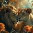 Glasschilderij romantisch leeuwenpaar oranje bloemen 160x110 cm