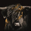 De afbeelding op dit glasschilderij toont een indrukwekkende close-up van een Schotse Hooglander, met zorgvuldig vastgelegde details en omgeven door een diepe zwarte achtergrond. De toevoeging van gouden accenten geeft dit kunstwerk een vleugje luxe en verfijning.
