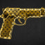Op het glazen canvas schittert een beeld van intrigerende contrasten: een gouden pistool, subtiel versierd met het iconische Louis Vuitton-logo. De afbeelding is verbluffend scherp, waardoor elk detail van dit kunstwerk met precisie wordt weergegeven.