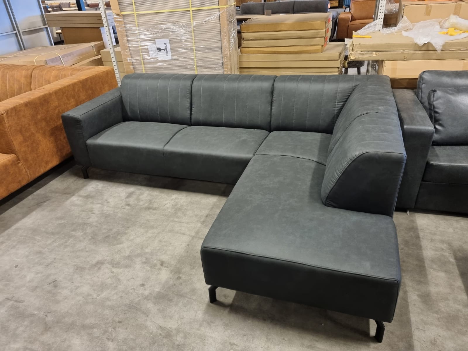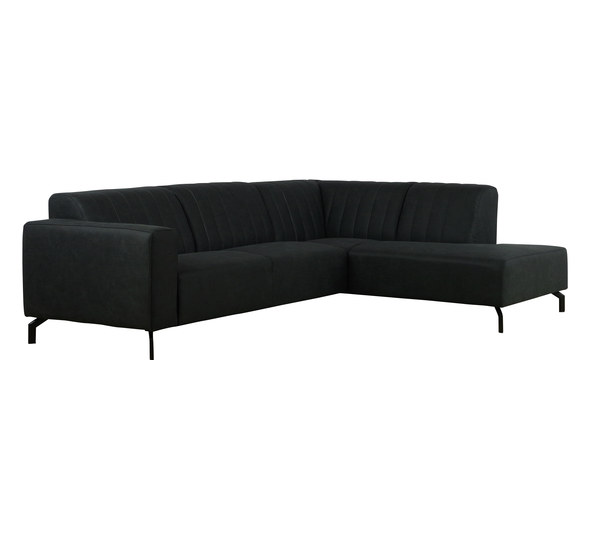 Deze gave hoekbank uitgevoerd in een sterke antraciet stof is de ideale hoekbank voor elke woonkamer. De zitting bestaat uit nozag veren die worden bedekt door een goede kwaliteit koudschuim laag. Daarboven op nog een laag diolenwatten voor een formidabel zitcomfort. De bank heeft een zacht tot stevig zitcomfort. De bank heeft vaste rug en zitkussen. Daarnaast is de rugleuning afgewerkt met fraaie verticale strepen die deze bank een unieke uitstraling geven. De poten zijn gemaakt van zwart metaal en geven deze bank nog een industriële touch. Deze bank is ook leverbaar in spiegelbeeld. (eindstuk links).