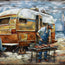 3D schilderij caravan bbq op het strand met surfplanken 120x80 cm