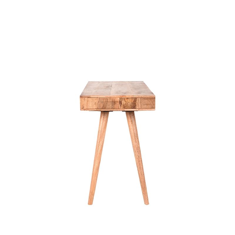 Bureau Steady, uitgevoerd in rough mangohout, bestaat uit een strak, stevig, rechthoekig blad. Aan de linkerkant onder het blad bevindt zich een schuiflade met ladegeleiders. Aan de rechterkant bevindt zich een open ruimte, waar papierzaken of andere spulletjes in opgeborgen kunnen worden. De ronde, schuin aflopende poten geven het bureau een speelse en levendige touch.