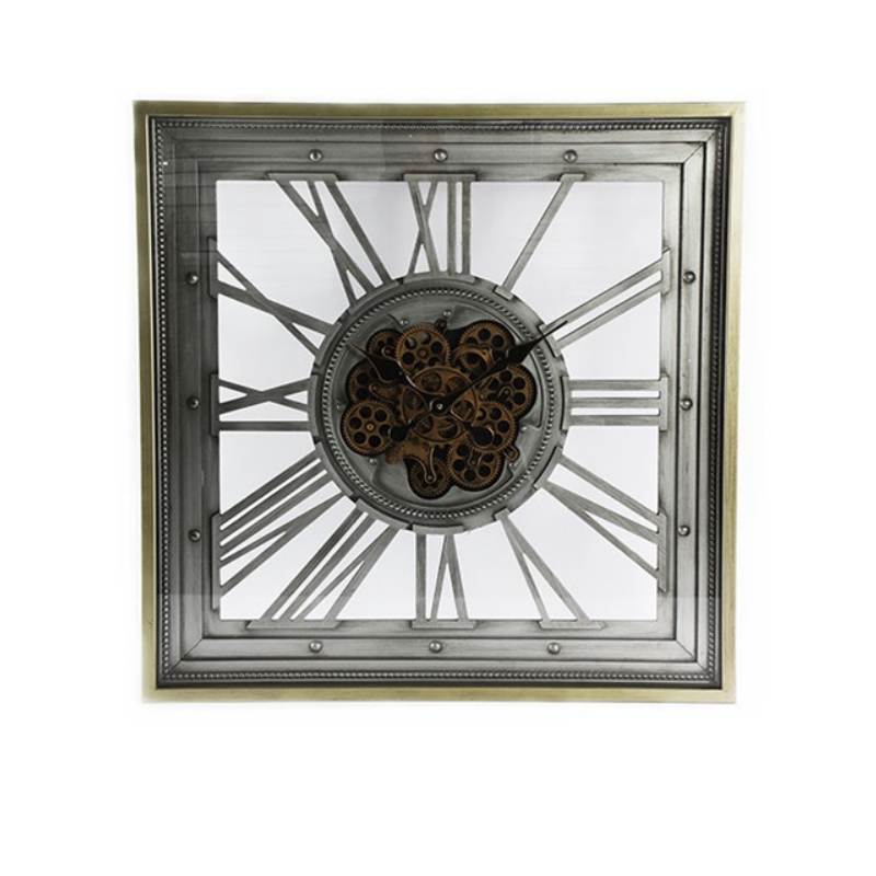 Ben je op zoek naar een hele grote vierkante wandklok? Zoek dan niet verder! Deze unieke vierkante radarklok trekt alle aandacht naar zich toe. Met een buitenmaat van maar liefst 80x80 cm valt deze klok niet te missen aan de muur. De rond draaiende binnen radars maken de klok echt af. Deze grote vierkante wandklok heeft een grijze messing afwerking. De klok geeft de tijd aan in romeinse cijfers. Deze cijfers vertellen je graag hoe laat het is : tijd om te bestellen!