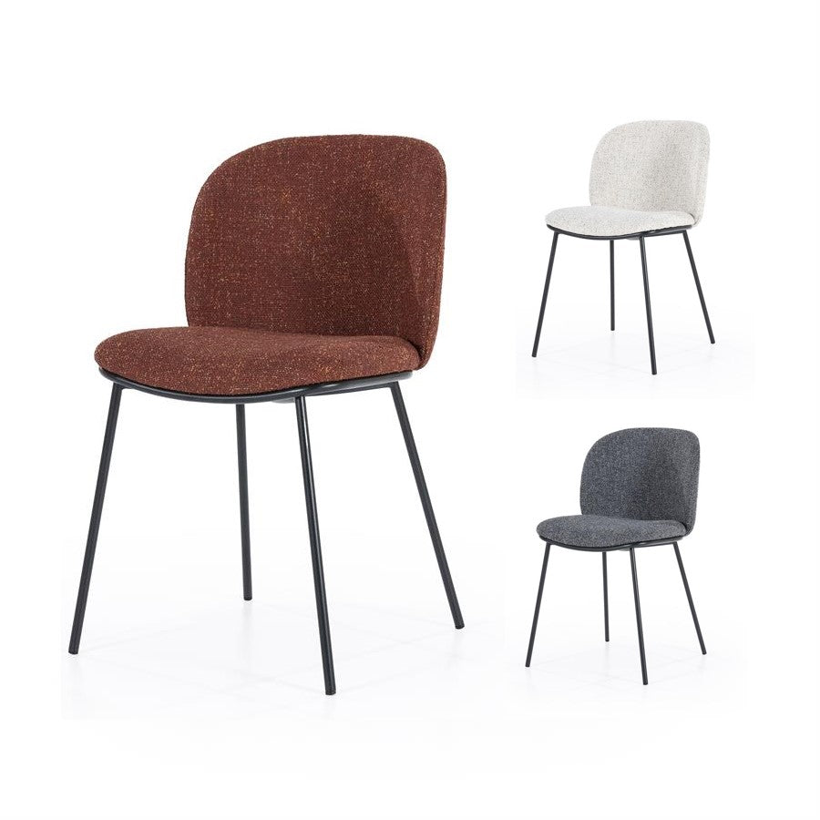 De Clypso eetkamerstoel is verkrijgbaar in drie krachtige stofkleuren: terracotta, antraciet en beige. Deze kleuren zijn niet alleen trendy, maar ook tijdloos, waardoor ze moeiteloos passen bij diverse interieurstijlen. Met een metalen onderstel en een simplistisch design straalt de Clypso stoel een moderne en minimalistische esthetiek uit.