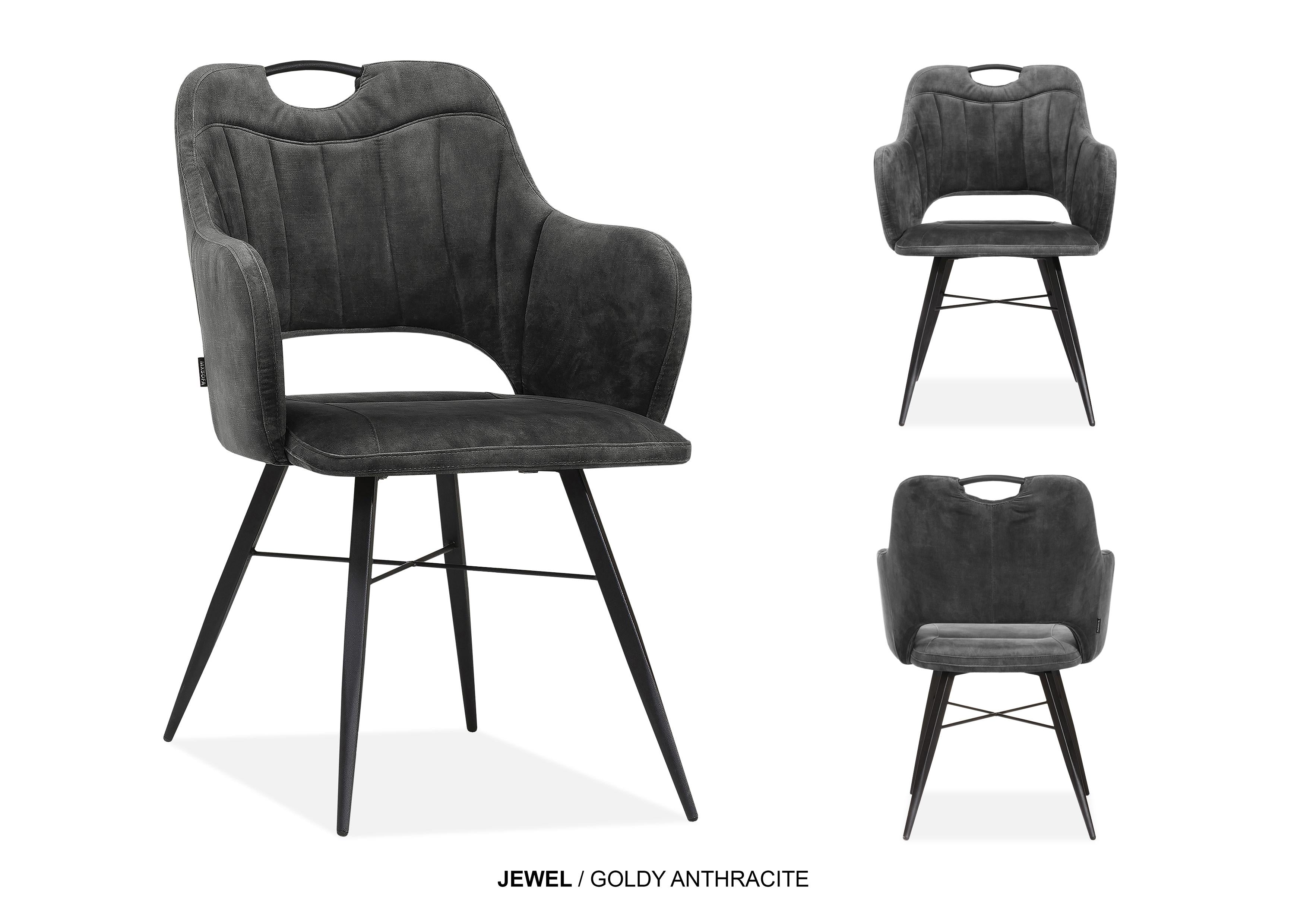 De Eetkamerstoel Jewel met armleuning is de perfecte combinatie van comfort en stijl. Deze elegante stoel is uitgevoerd in een sterke velours velvet stof en is verkrijgbaar in drie tijdloze kleuren: antraciet, cognac en groen. Met zijn afmetingen van 61x63x87 cm (bxdxh) en de hoogwaardige stoffering biedt de Jewel eetkamerstoel optimaal zitcomfort, ideaal voor lange diners of gezellige avonden aan tafel.