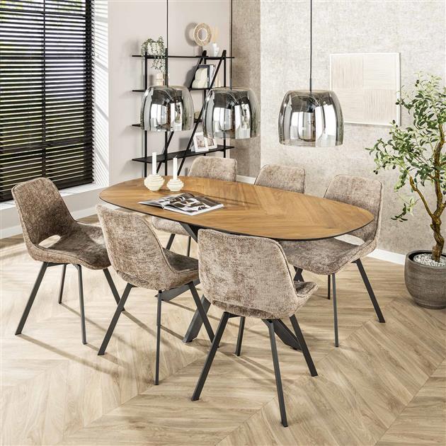 Maak je eetkamer compleet met de stijlvolle en functionele eetkamerstoel Swivel. Deze draaibare stoel zonder armleuningen is bekleed met een luxe, grof geweven chenille stof in een chique champagnekleur. De rijke structuur van de stof geeft de stoel een warme, moderne uitstraling en zorgt voor een comfortabele zitervaring.