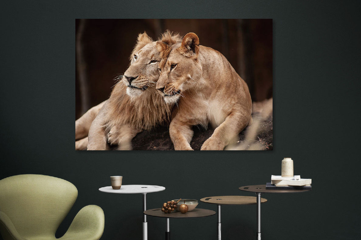 Door de unieke afmetingen en het prachtige design past dit schilderij perfect in verschillende inrichtingsstijlen, van modern tot bohemian. Laat de kracht en liefde van deze leeuwen uw ruimte vullen en geniet dagelijks van dit kunstwerk dat uitnodigt tot bewondering en gesprek.