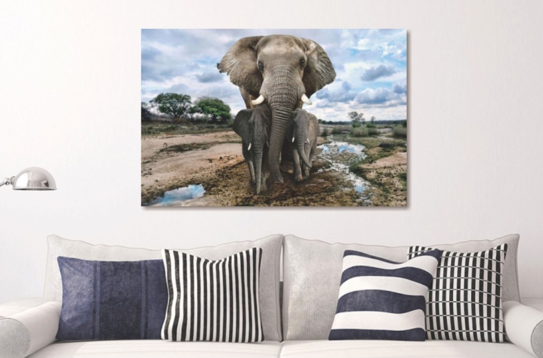 Breng de krachtige en hartverwarmende aanwezigheid van olifanten in hun natuurlijke omgeving in huis met dit unieke glasschilderij. Bestel vandaag nog en voeg een vleugje natuurlijke pracht toe aan je leefruimte met de afbeelding van een olifantenmoeder met twee kleintjes op een 120x80 cm grote glasplaat.