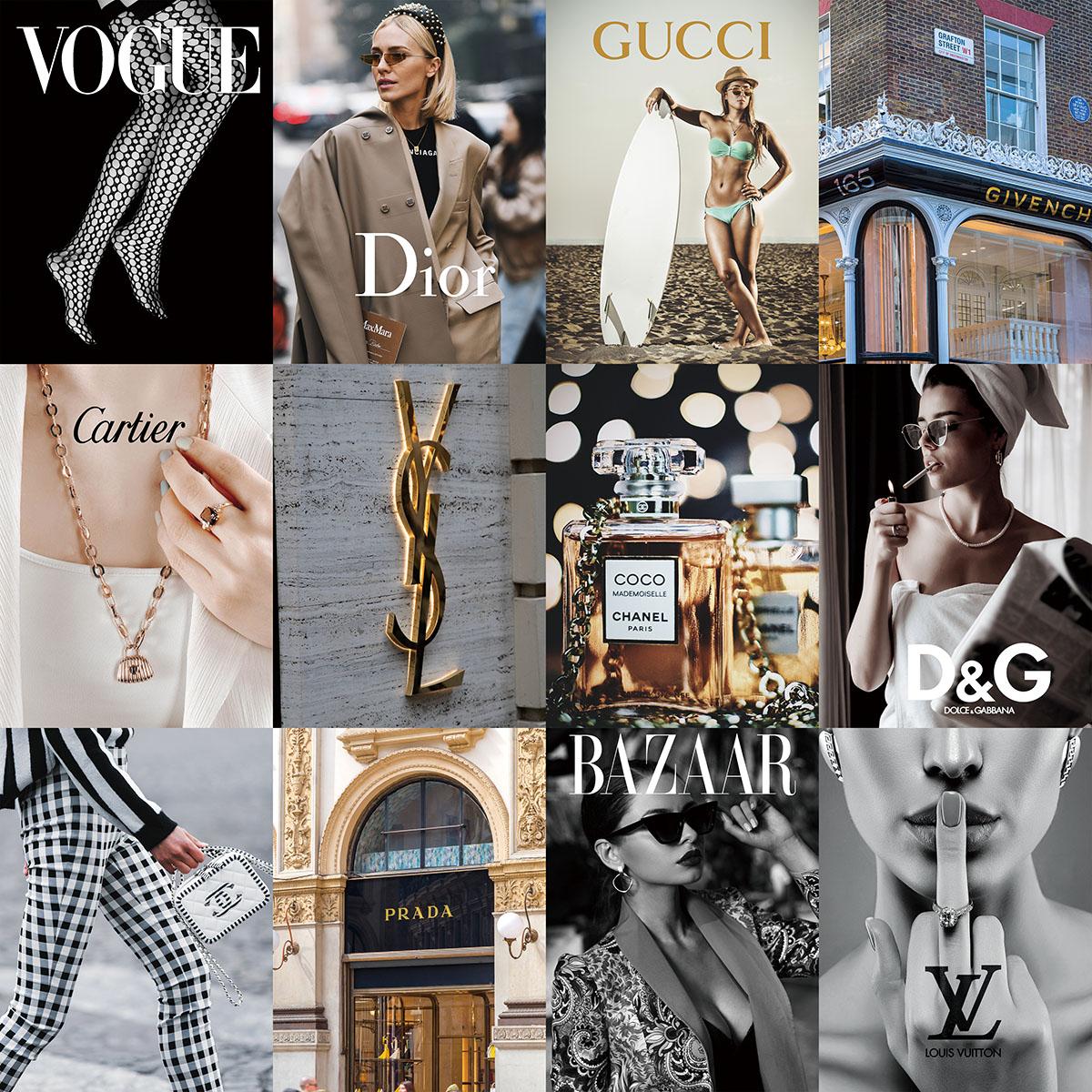 Betreed de wereld van luxueuze mode met ons opvallende glasschilderij van 120x120 cm. Dit kunstwerk, gevuld met foto's van gerenommeerde fashion merken zoals Gucci, Cartier, Dior, Bazaar, Louis Vuitton, Chanel, Prada, en meer, is in 3D geprint op duurzaam 4 mm dik glas. Het brengt niet alleen visuele pracht in je leefruimte, maar ook een eerbetoon aan de iconen van de modewereld.