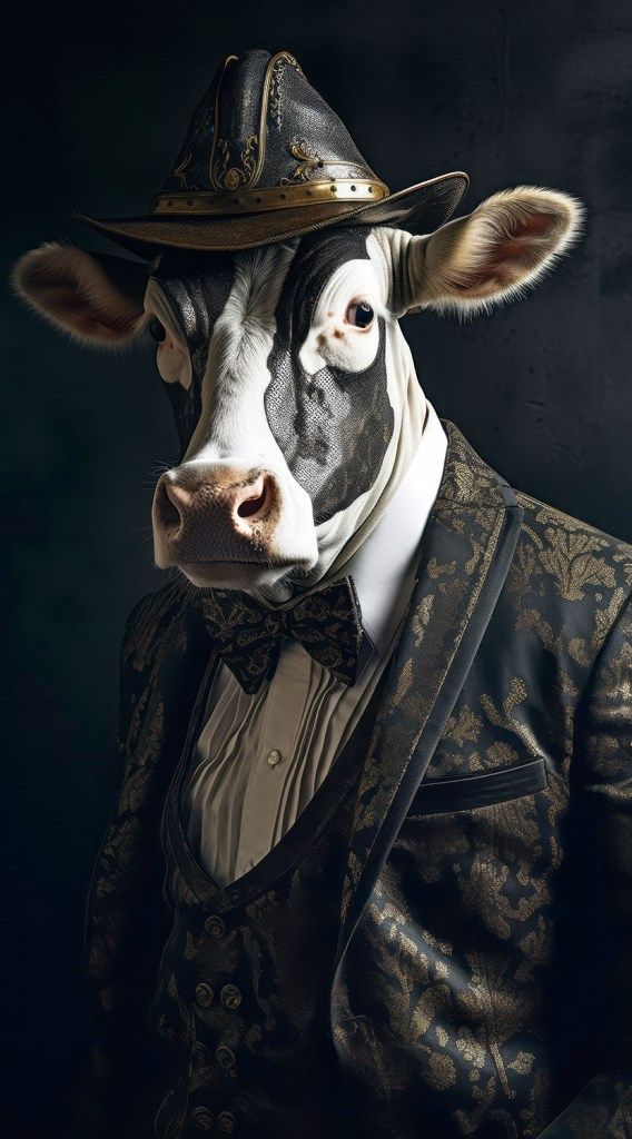 In het middelpunt van dit meesterwerk schittert een vriendelijke koeienkop, gekleed in een tijdloos pak en op elegante wijze getooid met een hoed. Deze gedurfde en unieke keuze geeft niet alleen een artistieke flair aan het schilderij maar maakt het ook tot een verrassend en gesprekswaardig kunstwerk.