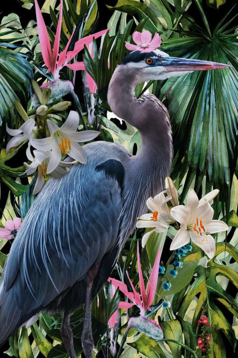 Op het glazen canvas komt een beeld tot leven van een elegante blauwe reiger, geflankeerd door levendige bloemen die een kleurrijk contrast bieden op de achtergrond. De afbeelding is verbluffend scherp, waardoor elk detail van de reiger en de bloemenpracht met precisie wordt weergegeven.