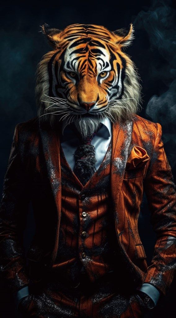 In het middelpunt van dit meesterwerk staat een krachtige tijgerkop, getooid in een stijlvol pak, waardoor dit schilderij een unieke en gedurfde esthetiek krijgt. Deze combinatie van wildheid en verfijning maakt het niet alleen een artistiek pronkstuk maar ook een boeiend gespreksonderwerp.