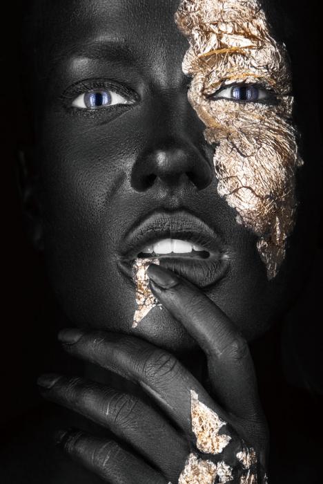Op het glazen canvas komt een beeld tot leven van een gracieuze donkere vrouw, geaccentueerd door zorgvuldig aangebrachte gouden tinten die haar natuurlijke schoonheid subtiel benadrukken. De afbeelding is verbluffend scherp, waardoor elk detail van de vrouw en de gouden accenten met precisie wordt weergegeven.
