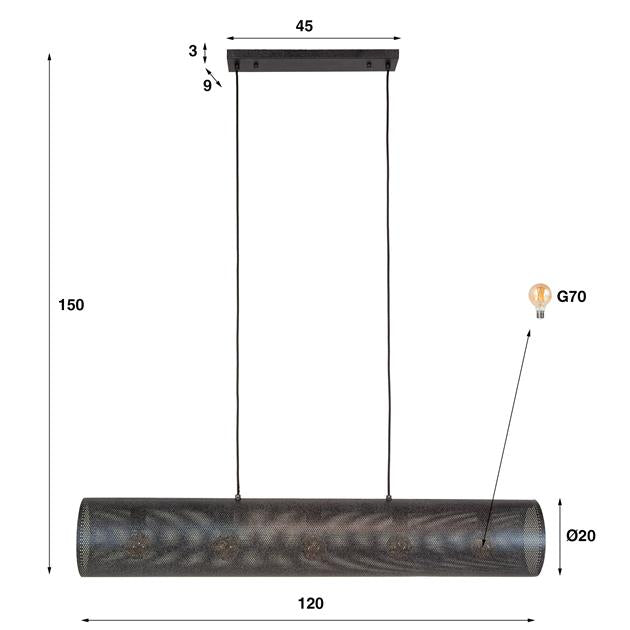 Met een afmeting van 1,20m x 0,20m x 1,50m en een gewicht van slechts 7,5 kg is deze lamp licht in gebruik, maar zwaar in zijn ontwerp. Het unieke koker mesh-ontwerp laat het licht op een speelse manier filteren, wat zorgt voor een warme en uitnodigende ambiance. Het gebruik van een LED lichtbron [G70] filament bol Ø7 - E27 (art. 8465) maakt deze hanglamp energiezuinig en duurzaam, wat niet alleen goed is voor het milieu, maar ook voor je portemonnee.