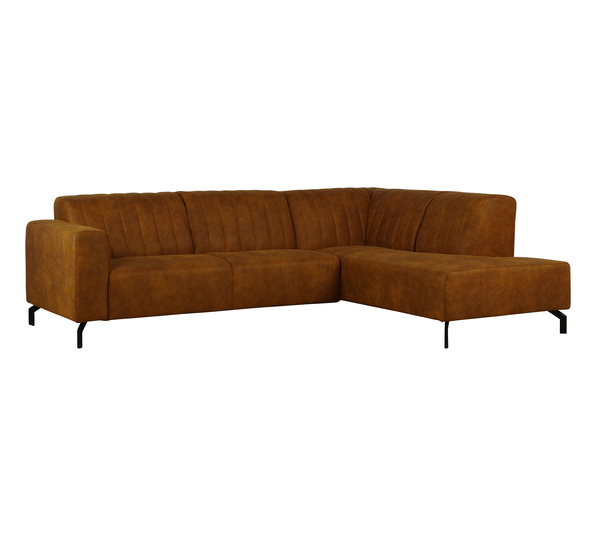Deze gave hoekbank uitgevoerd in een sterke cognac stof is de ideale hoekbank voor elke woonkamer. De zitting bestaat uit nozag veren die worden bedekt door een goede kwaliteit koudschuim laag. Daarboven op nog een laag diolenwatten voor een formidabel zitcomfort. De bank heeft een zacht tot stevig zitcomfort. De bank heeft vaste rug en zitkussen. Daarnaast is de rugleuning afgewerkt met fraaie verticale strepen die deze bank een unieke uitstraling geven. De poten zijn gemaakt van zwart metaal en geven deze bank nog een industriële touch. Deze bank is ook leverbaar in spiegelbeeld (eindstuk links) .