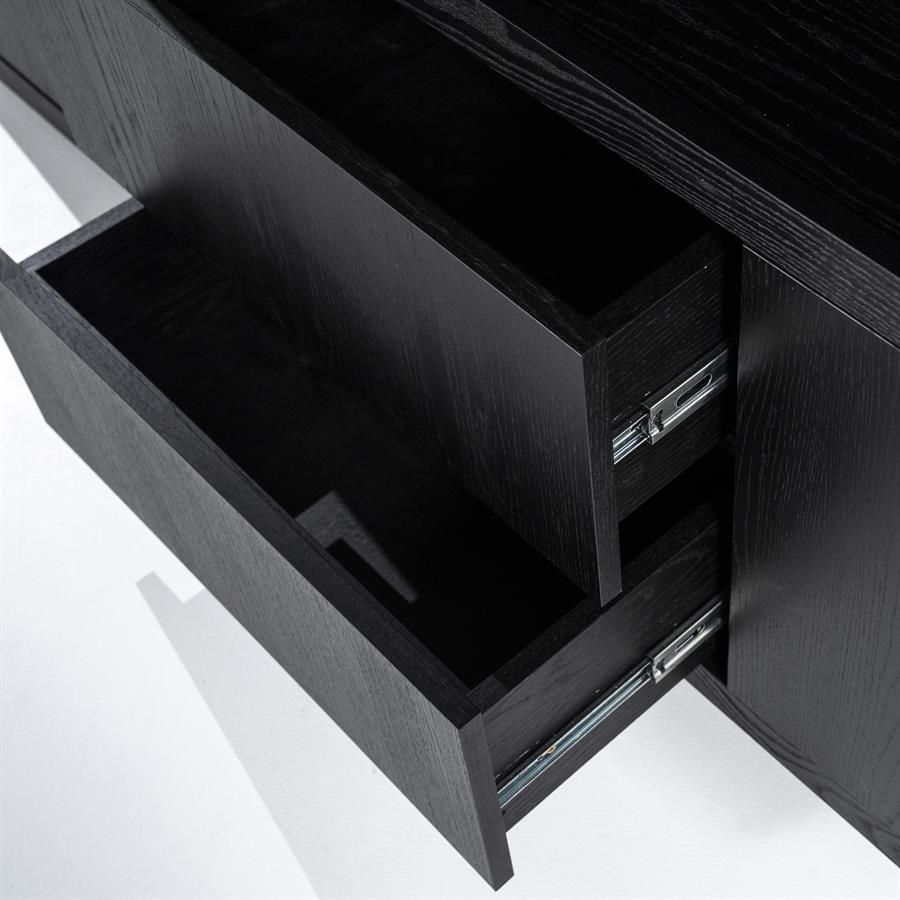 De kast bestaat uit twee delen die eenvoudig op elkaar geplaatst worden. Dankzij de praktische indeling met 4 deuren, 2 laden en 6 open vakken heb je volop ruimte om servies, boeken of woonaccessoires netjes op te bergen én te presenteren. Het gebruik van massief eiken en eiken fineer geeft de kast een luxe en duurzame uitstraling, terwijl de zwarte afwerking perfect past in een modern, industrieel of Scandinavisch interieur.