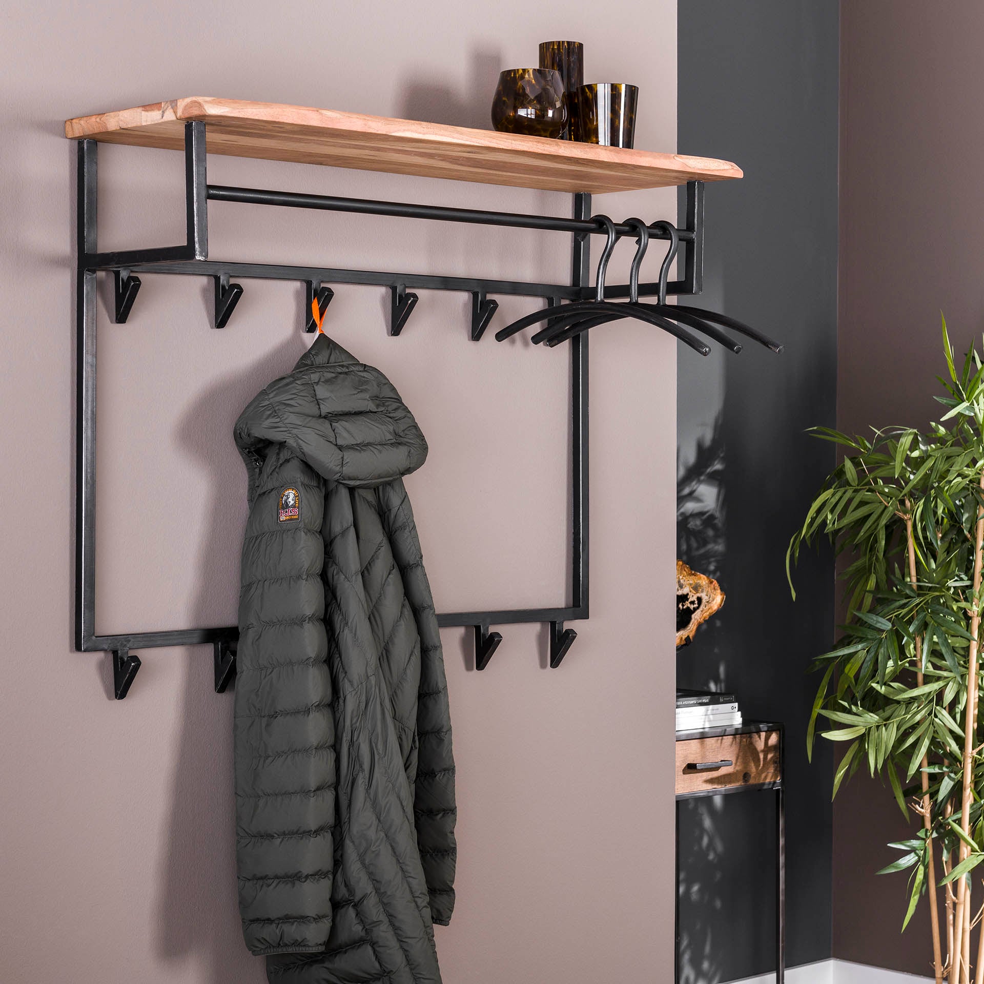 Deze kapstok is voorzien van een hoedenplank gemaakt van massief acacia hout van 25 millimeter dik. Zorgvuldig geselecteerd hout, voorzien van een fijne nerf en diverse noesten, die op ambachtelijke wijze wordt verwerkt. Dit zorgt voor een natuurlijke én unieke look aan de wand. Aan de hoedenplank is een zwart geschuurd metalen roede bevestigd en zijn er 12 haakjes aanwezig. Er kunnen dus zowel jassen aan een haakje als aan een hanger worden opgehangen. De kapstok is voorzien van twee bevestigingsogen aan de achterzijde, zodat de kapstok eenvoudig aan de wand kan worden gemonteerd.