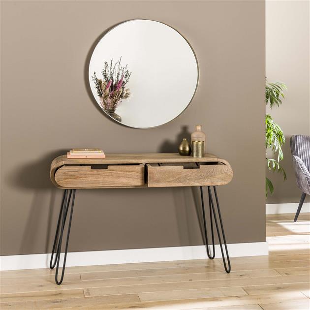 Deze kaptafel 'barrel' is uitgevoerd in mango hout met een metalen frame afgewerkt in zwart poedercoat. De afgevlakte hoeken geven een heel trendy beeld. Het kastje is leuk te gebruiken als kaptafel of als haltafel! Een echte musthave! Deze kaptafel behoort tot de 'barrel' serie.