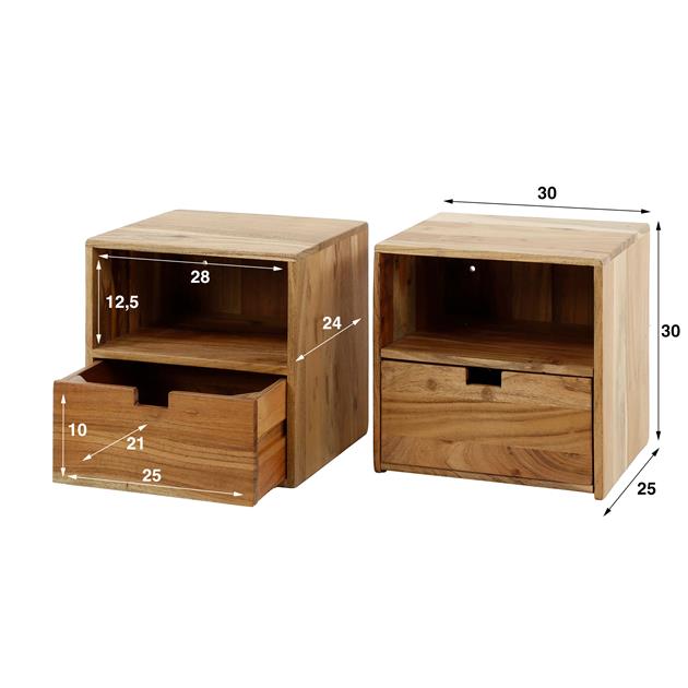 Ontdek het perfecte nachtkastje voor jouw slaapkamer met de set van twee hangende nachtkastjes van massief acacia in een prachtige natuurlijke kleur. Deze compacte nachtkastjes zijn ontworpen met een strakke en moderne uitstraling die naadloos past in elke interieurstijl. Met afmetingen van 30x25x30 cm zijn deze nachtkastjes perfect voor kleine ruimtes waar je toch functionaliteit wilt behouden.