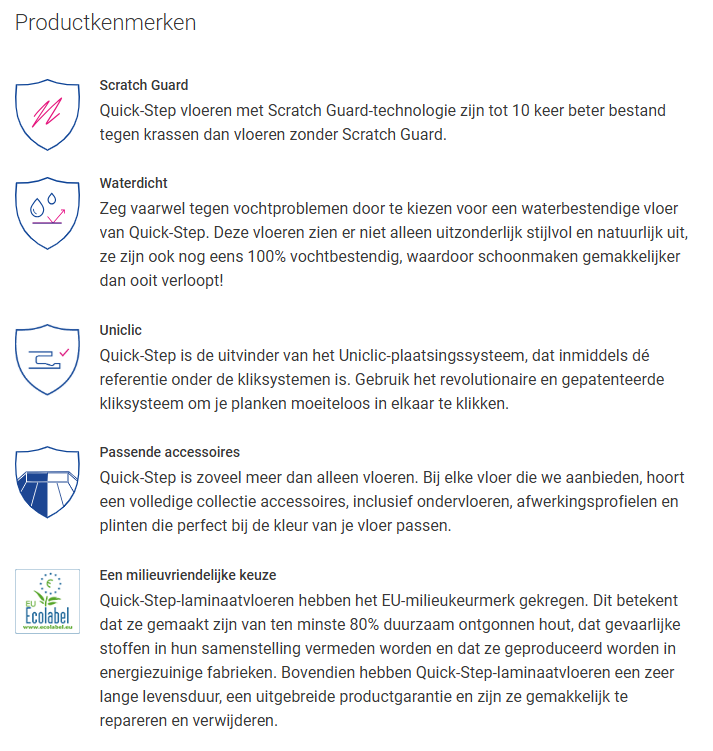 Quick-Step staat bekend als een van de beste laminaatmerken van Nederland. De vloeren zijn krasbestendig, onderhoudsvriendelijk en hebben een lange levensduur. Dankzij de natuurgetrouwe houtpatronen biedt Quick-Step laminaat een perfecte combinatie van stijl en functionaliteit.