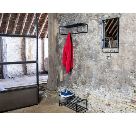 De producten uit de Clint serie zijn vervaardigd uit stalen buizen die in een ronde vorm gebogen zijn. Hierdoor heeft de producten een moderne, maar ook een industriële uitstraling. Deze Clint spiegel is goed te combineren met de overige producten uit de Clint serie, waaronder de schoenenrekken en wandkapstokken.