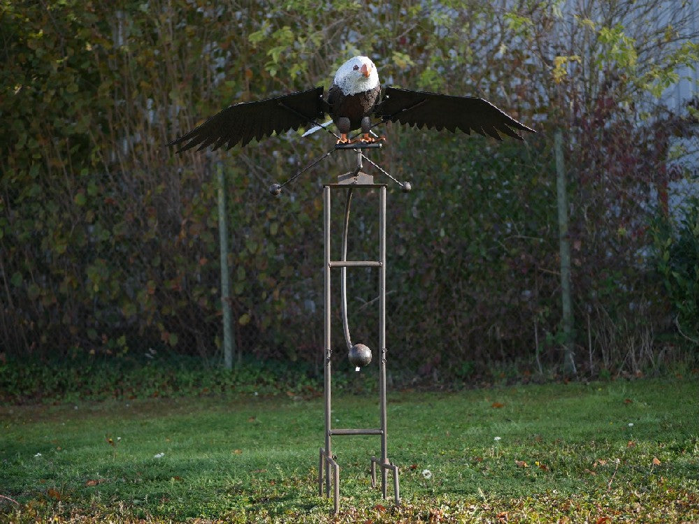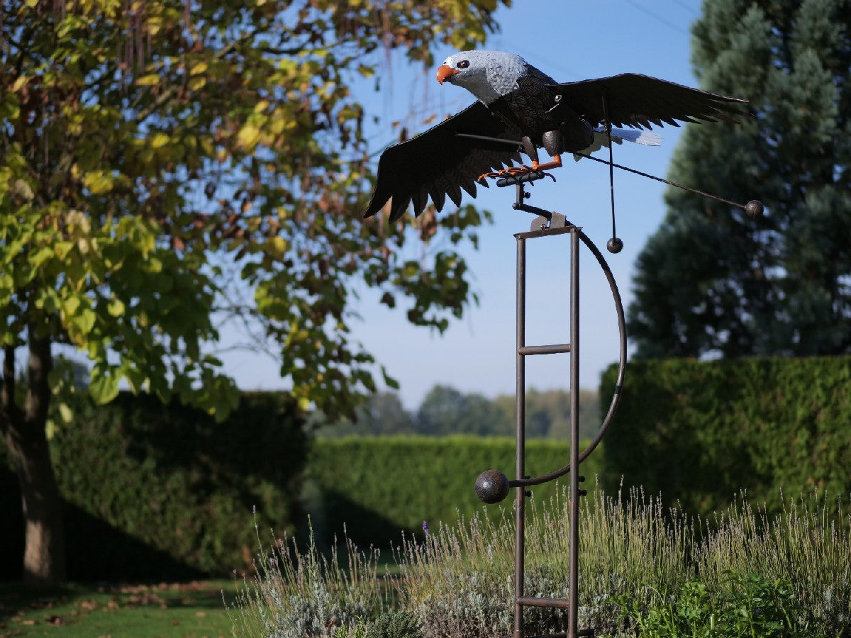 Deze enorm grote metalen tuinsteker van een adelaar is een echte eye-catcher in je tuin! Door de ijzeren bal aan de onderkant van de adelaar blijft deze prachtige roofvogel goed balanceren en spreiden de vleugels zich prachtig uit. Een uniek item voor in de tuin, voor echte liefhebbers!