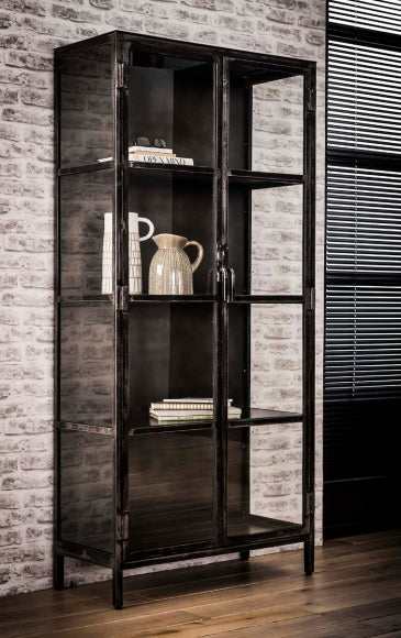 Deze vitrinekast heeft veel weg van onze Rift-serie. Echter door het veelvuldig gebruik van gun metal, wordt dit exemplaar Rift Metal genoemd. De vitrinekast is voorzien van 2 glazen deuren en 3 schappen. Vitrinekast Rift metal wordt opgebouwd geleverd.