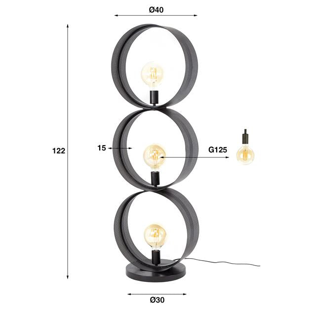 Maak uw interieur compleet met de **Vloerlamp 3L ring geperforeerd** in een prachtige **Charcoal** kleur. Deze lamp is niet alleen een verlichtingsbron, maar ook een stijlvol meubelstuk dat elke ruimte in uw huis kan transformeren. Met een hoogte van **122 cm** en een breedte van **30 cm**, is deze vloerlamp perfect voor zowel ruime als compactere settings.